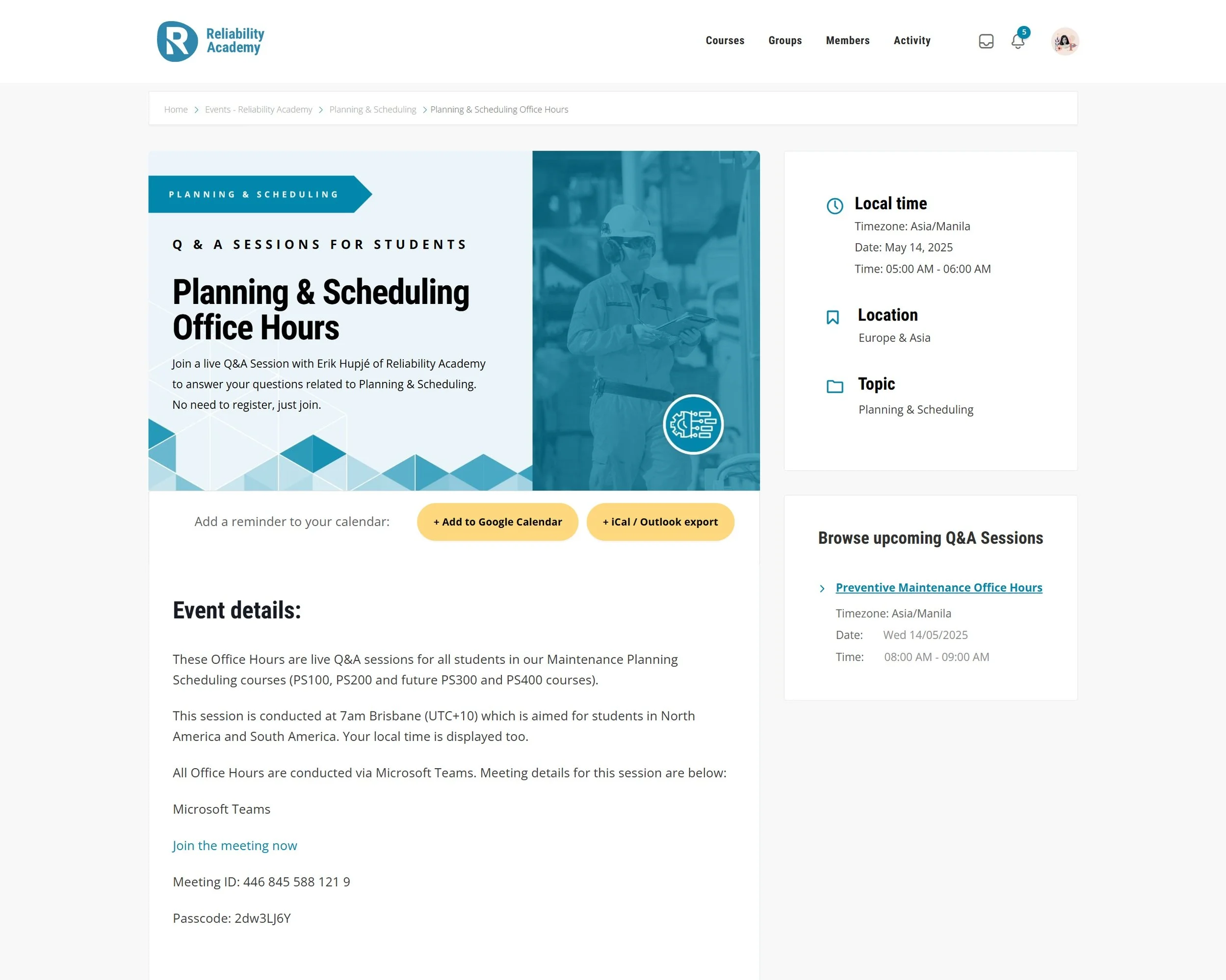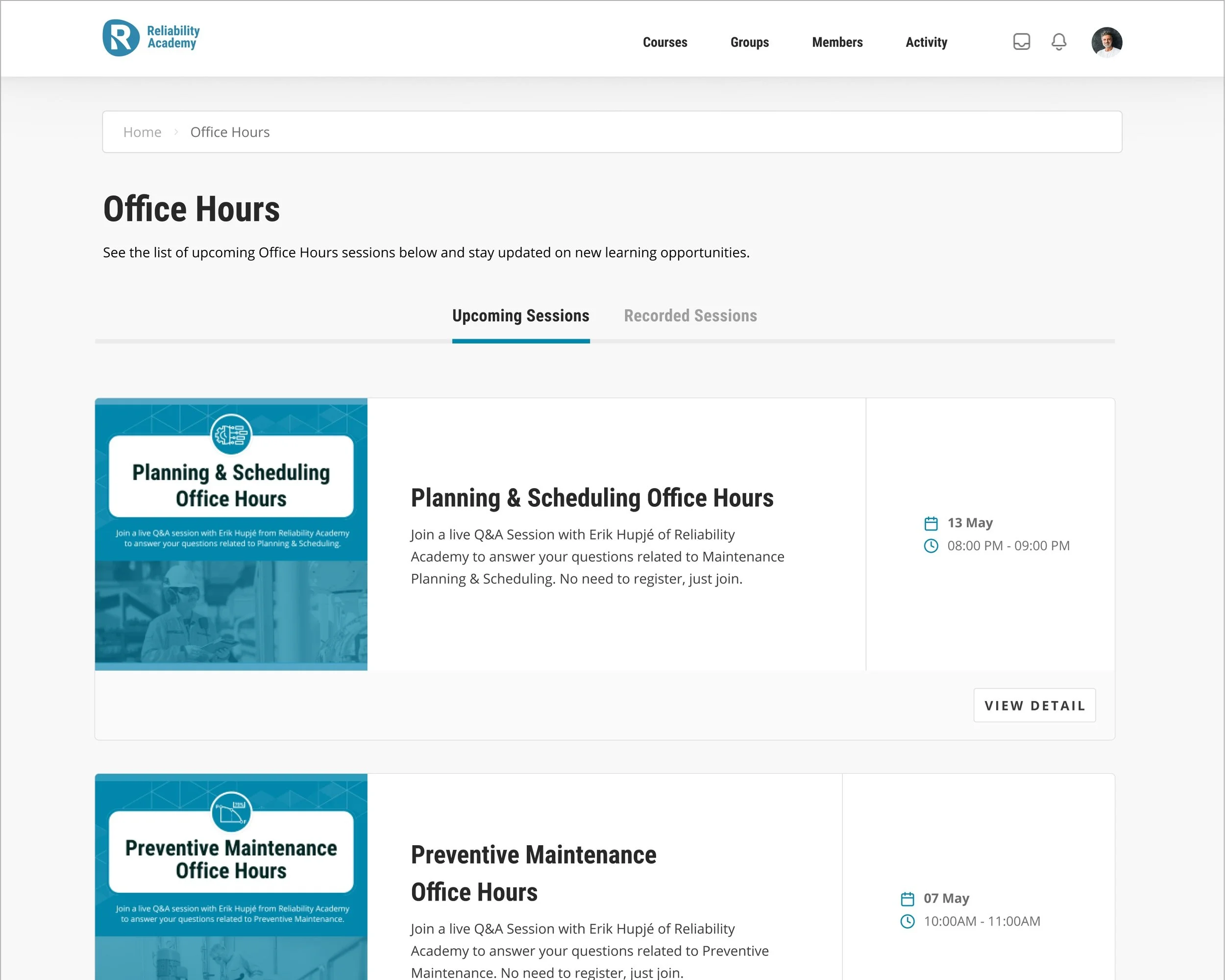 Reliability Academy needed a clearer way to present Office Hours sessions, but users struggled with confusing filters and poor content discoverability. I redesigned the experience using Figma wireframes and internal usability feedback, replacing dropdown filters with intuitive tabs for Upcoming and Recorded sessions, updating event details, and adding related session widgets. The result was a cleaner interface that made it easier for users to find and engage with session content.